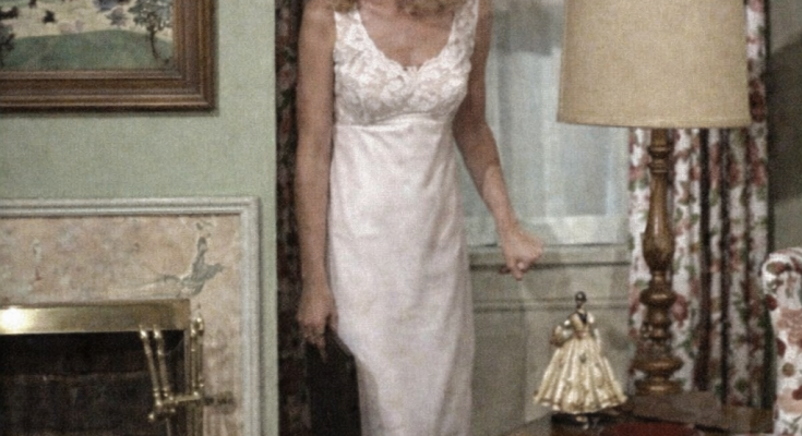 At first glance, this scene feels like a typical moment from a 1960s television show. A woman stands in a neatly decorated living room, surrounded by soft lighting, patterned curtains, and carefully arranged furniture that reflects the style of the era.
