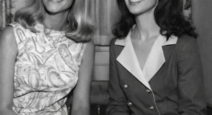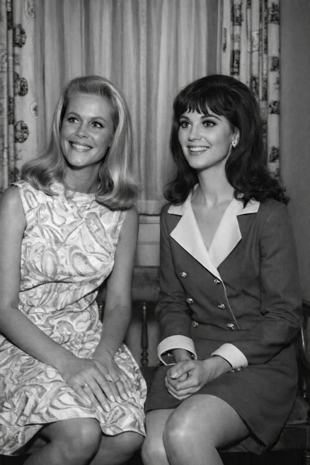 At first glance, this image feels like a simple and elegant portrait from the 1960s. Two women sit side by side, smiling naturally, framed by soft lighting and classic styling that reflects the era.