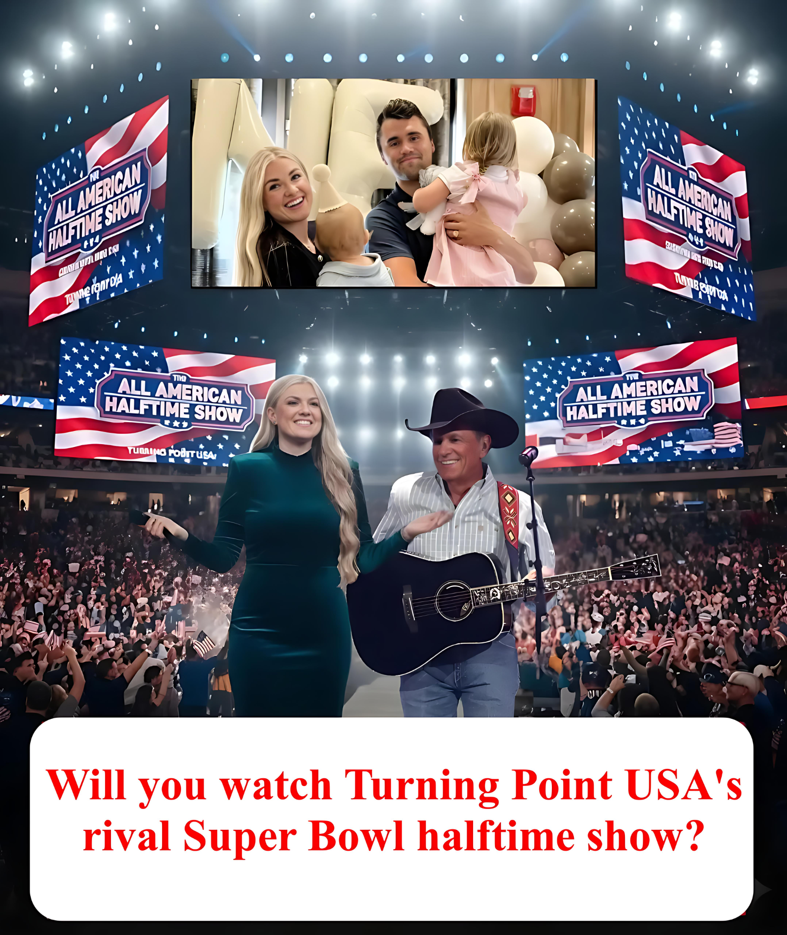 Keywords: George Strait halftime show, All-American Halftime Show, Erika Kirk Charlie Kirk tribute, Super Bowl 60 rival, faith family freedom, patriotic country music